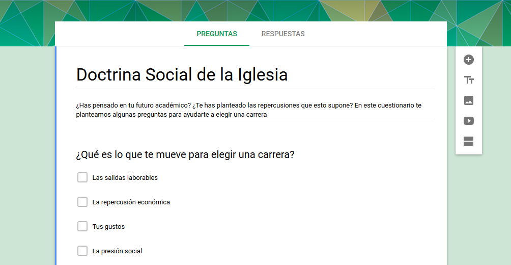 En este apartado encontrarás cuestionarios basados en la influencia de la Doctrina Social de la Iglesia en tu elección académica.